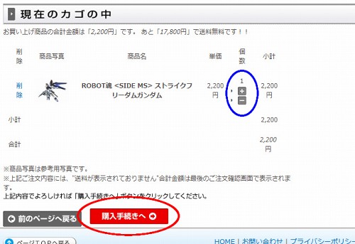するとこちらの画面に移動します。青丸部分の「+」と「-」ボタンで商品の個数を増減出来ます。購入制限数が有る場合は制限数を超えて増やす事は出来ません。